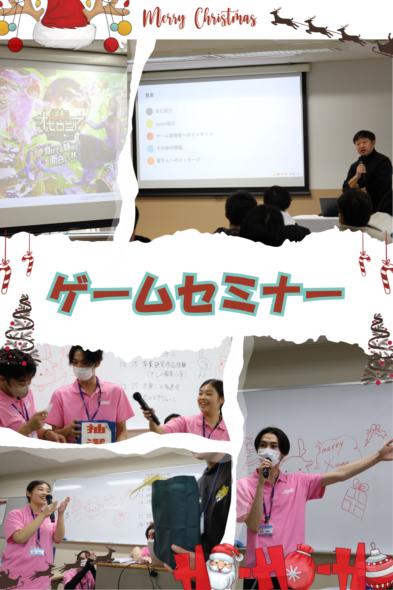 令和7年12月21日(日)のオープンキャンパスにて「JOHOゲームセミナー」を開催しました。今回は「株式会社ディー・エヌ・エー(DeNA)」より「ゲームサービス事業本部/藤村 幹雄 様」を迎え、ゲームがどのように作られ、どんな可能性を持っているのかを話いただきました。昨今のリモートワークを中心とした働き方や、ゲーム事業におけるAI活用の現状についてお話して頂き、大変有意義な時間となりました。質疑応答の時間では、多くの質問をいただき、最後まで活気あふれる雰囲気で終えることができました。ゲームセミナー後は、恒例の「お楽しみ抽選会」を実施し、会場のボルテージは最高潮に!参加者の皆さんも大変満足していただけたオープンキャンパスとなりました。